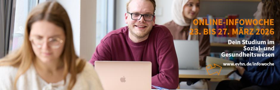 Abi und dann? Ausbildung und Studium? Schon im Berufsleben und studieren? In der Info- und Beratungswoche vom 23. bis 27. März 2026  informieren Lehrende und Studierende der EVHN über Studiengänge in den Bereichen Soziale Arbeit, Sozial- und Gesundheitswirtschaft, Pädagogik, Pflege, Management sowie Religionspädagogik und Diakonik. Darüber hinaus gibt es  u.a Informationen über die Möglichkeit, im Ausland zu studieren oder ein Praktikum zu absolvieren, Themen rund um die Studienberatung u. v. m.