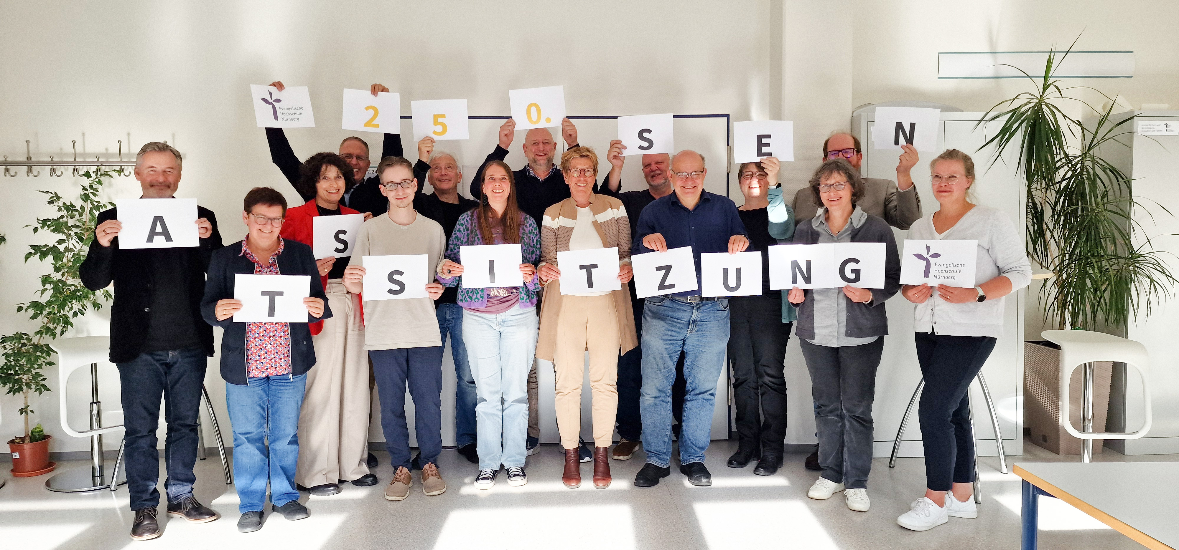 Am 15. Oktober 2025 kam der Senat der EVHN zu seiner 250. Sitzung zusammen. Der Senat ist neben Präsidium, Kuratorium und Versammlung eines der vier Organe der EVHN. Die 13 stimmberechtigten Mitglieder des Senats vertreten die unterschiedlichen Anspruchsgruppen innerhalb der Hochschule: Professorinnen und Professoren, Lehrkräfte mit besonderen Aufgaben, wissenschaftliche und sonstige Mitarbeiterinnen und Mitarbeiter sowie Studierende. Mit beratender Stimme gehören dem Senat zudem das Präsidium und die Gleichstellungsbeauftragte an. Aufgabe des Senats ist insbesondere die Verabschiedung der für die geordnete Arbeit erforderlichen Satzungen (z. B. Studien- und Prüfungsordnungen). Außerdem beschließt er den Entwurf des Haushalts- und Stellenplans und gibt Stellungnahme zu Berufungsverfahren und Entwicklungsprojekten des Präsidiums an. Auf diese Weise unterstützt er das Präsidium bei der Steuerung der Hochschule. Die Sitzungen des Senats sind hochschulöffentlich (außer bei Personalangelegenheiten), d. h. Studierende und Mitarbeitende können bei den Sitzungen anwesend sein. Die erste, konstituierende Sitzung des Senats war übrigens am 10. Juni 1998 an der (damaligen) Evangelischen Fachhochschule Nürnberg in der Burgschmietstraße 6. Themen damals waren u. a. der Festakt anlässlich des Bezuges den neuen Gebäudes mit allen drei Fachbereichen in der Bärenschanzstraße am 29.10.1998 sowie die Errichtung eines Auslandsamtes.